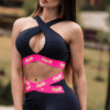 Cós com muita sustentação. Decote redondo na frente com recorte em filete. Duo de alças cruzadas nas costas. Combinações de cores sofisticadas.
